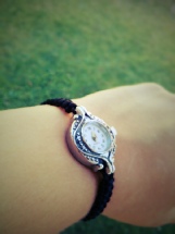 2) Svart armbånd Tråd: Svart nylon- Tilbehør: Klokke, sluttperler. Justerbar størrelse? Ja. |