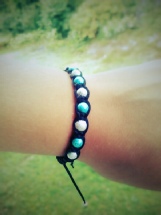 8) Svart armbånd Tråd: Rød nylon- Tilbehør: runde perler (hvit/turkis), sluttperler. Justerbar størrelse? Ja. |