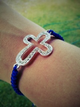 1) Blått armbånd Tråd: Blå nylon- Tilbehør: Stort sølvkors, sluttperler. Justerbar størrelse? Ja. |